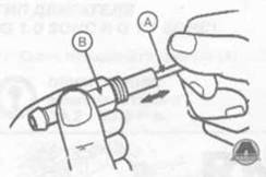 2. Вставить штифт (А) в клапан PCV (В) со стороны резьбы для проверки движения плунжера.