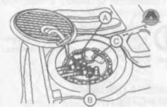 5. Отсоединить разъем (А) поплавка, трубку (В) подачи топлива, дренажную трубку (С).